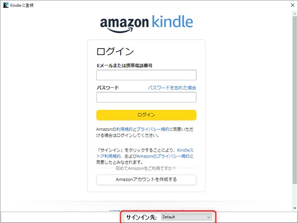 問題の根本原因はKindle for PCに最初にログインする時のログイン画面に「サインイン先」という項目があり、これをデフォルト値の「Default」のままにしておくと上記のようなアカウント状況では海外版サイトへのログインが優先されてしまうということのようです。