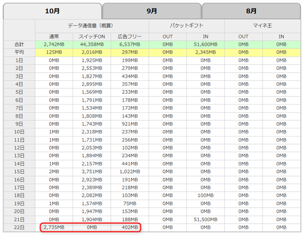以下がmineoの今月の利用履歴ですが、22日が問題の日です。