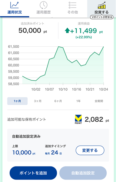 Vポイント運用は手動でスポット追加しようとすると1%の手数料を取られますので、入れたい分量の自動追加を設定して追加されたらすぐに設定を解除するというちょっとせこい手を使いました。