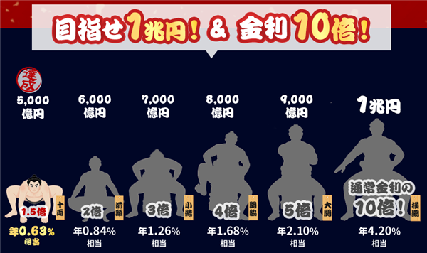 現状ほぼ確実なのはすでに達成済みの残高5,000億円で年0.63%。しかしまあここからボーナスや金利目当てで資金が集まってくるでしょうから、少なくとも1%超えは行くんじゃないでしょうか。