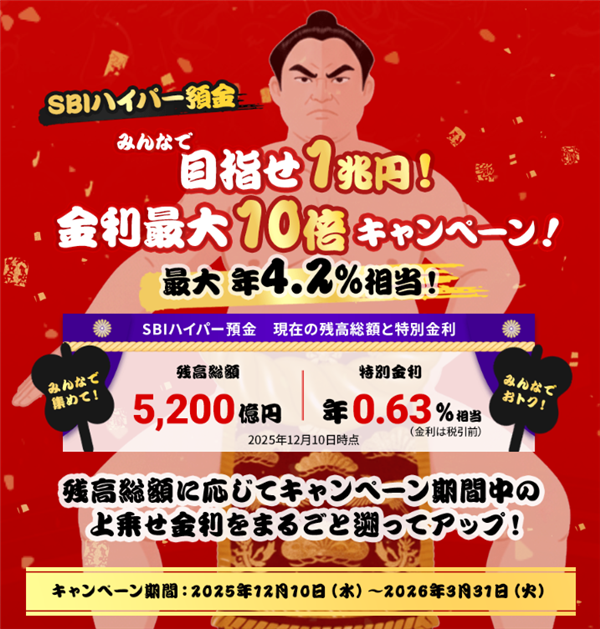 なおこのキャンペーン金利が適用されるのは2025年12月10日(水)~2026年3月31日(火)までのキャンペーン期間となります。キャンペーン開始日から100万円以上の残高を維持し、残高総額1兆円を達成していた場合の現金特典は約9,290円とのこと。