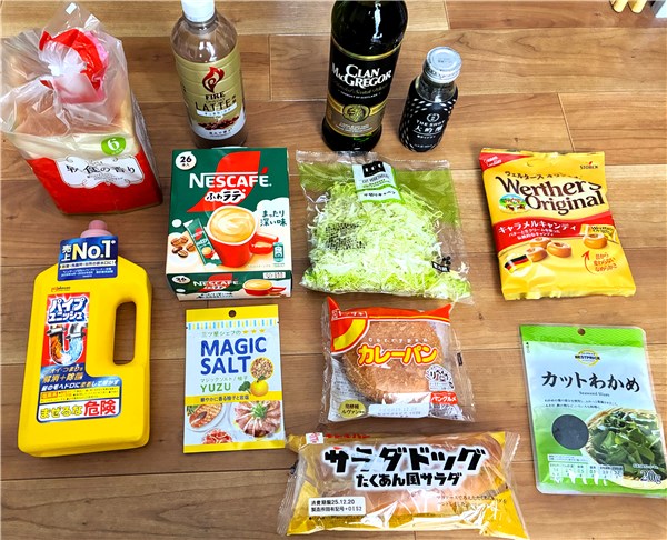 自分用の食品としては千切りキャベツ、カットわかめ、ミックススパイス、カレーパン、サラダドッグ、アメ、スティックコーヒー、ペットボトル ラテです。