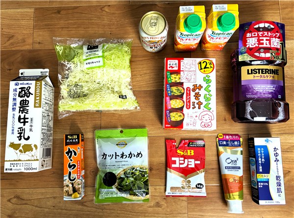 自分用の食品としては千切りキャベツとジュースが昼食用。フリーズドライみそ汁、カットわかめ、コショウ詰め替え用が在庫補充用です。
