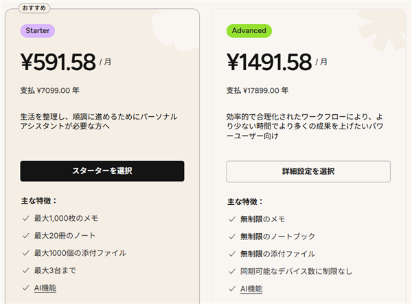 去年の段階ではまだまだ安いPersonalでも制限が緩かったのでPersonalにしましたが、現状のStarterには非常に厳しいノート数やノートブック数の制限がありますので、とても実用に耐えません。したがって再契約するなら高い方のプラン Advanced一択となります。